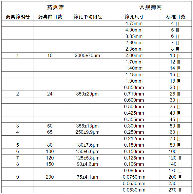 標準藥典篩常規(guī)篩孔徑網(wǎng)目數(shù)對照表