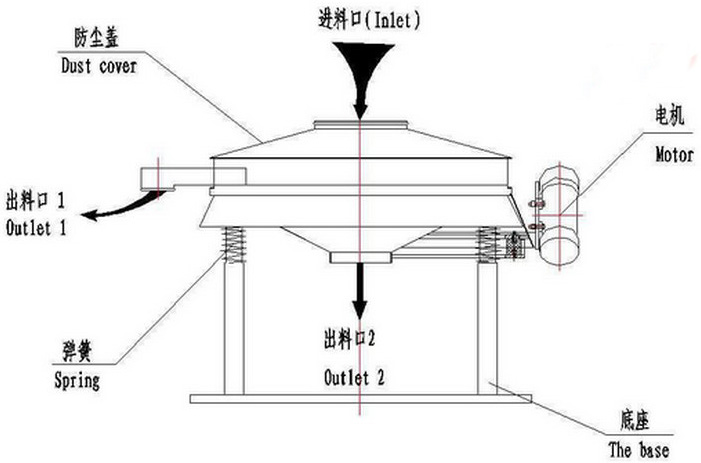 2:旋振篩是直立式電機(jī)作激振源,電機(jī)上、下兩端安裝有偏心重錘,將電機(jī)的旋轉(zhuǎn)運(yùn)動(dòng)轉(zhuǎn)變?yōu)樗?、垂直、傾斜的三次元運(yùn)動(dòng),再把這個(gè)運(yùn)動(dòng)傳遞給篩面。調(diào)節(jié)上、下兩端的相位角,可以改變物料在篩面上的運(yùn)動(dòng)軌跡。旋振篩是一種高精度細(xì)粉篩分機(jī)械,其噪音低、效率高,快速換網(wǎng)需3-5分鐘,全封閉結(jié)構(gòu),適用于粒、粉、粘液等物料的篩分過濾。